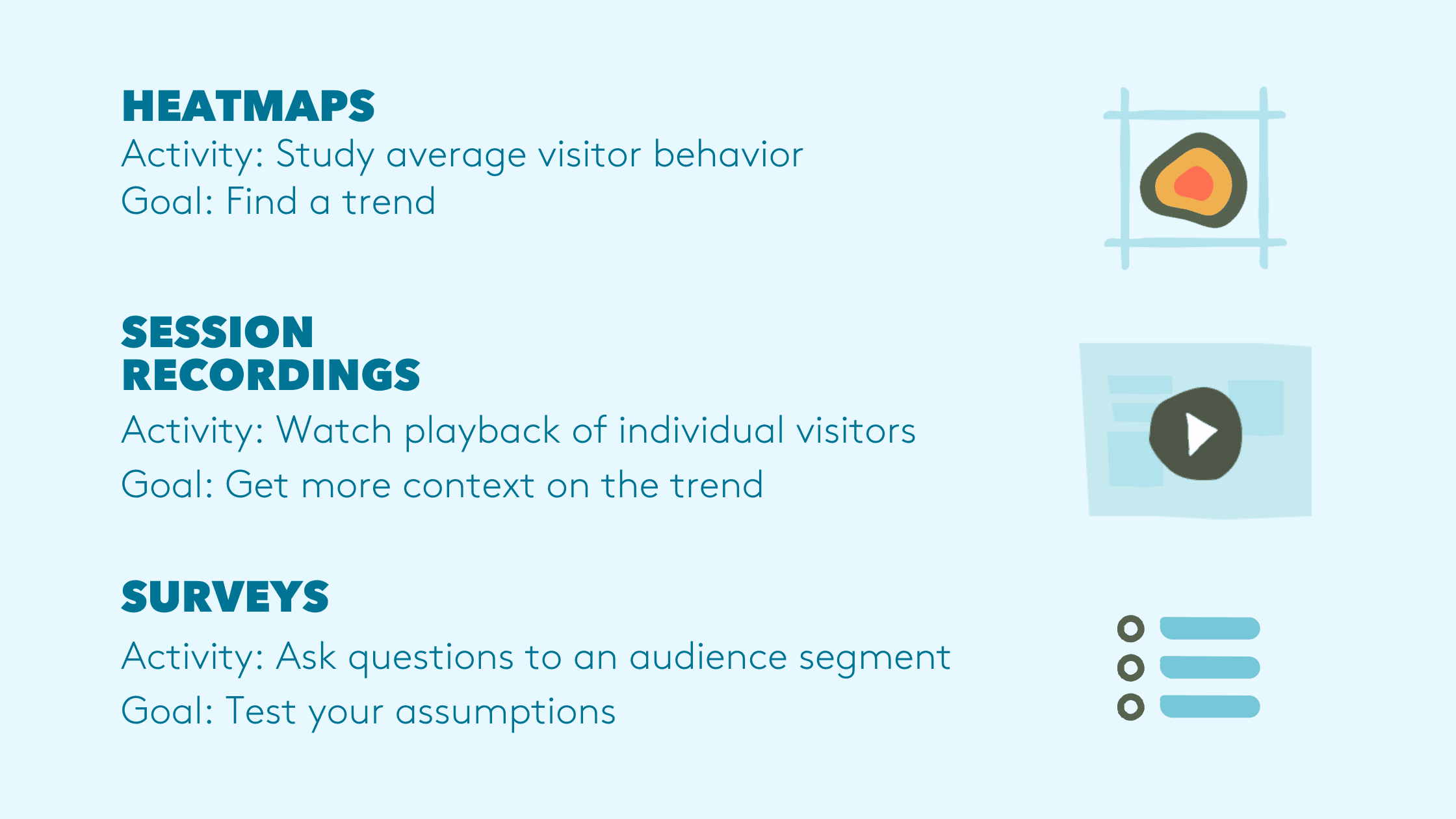 We like to think of heatmaps, recordings and surveys as a trio of tools to use together to discover valuable insights that can lead to an improved website experience and a higher conversion rate.