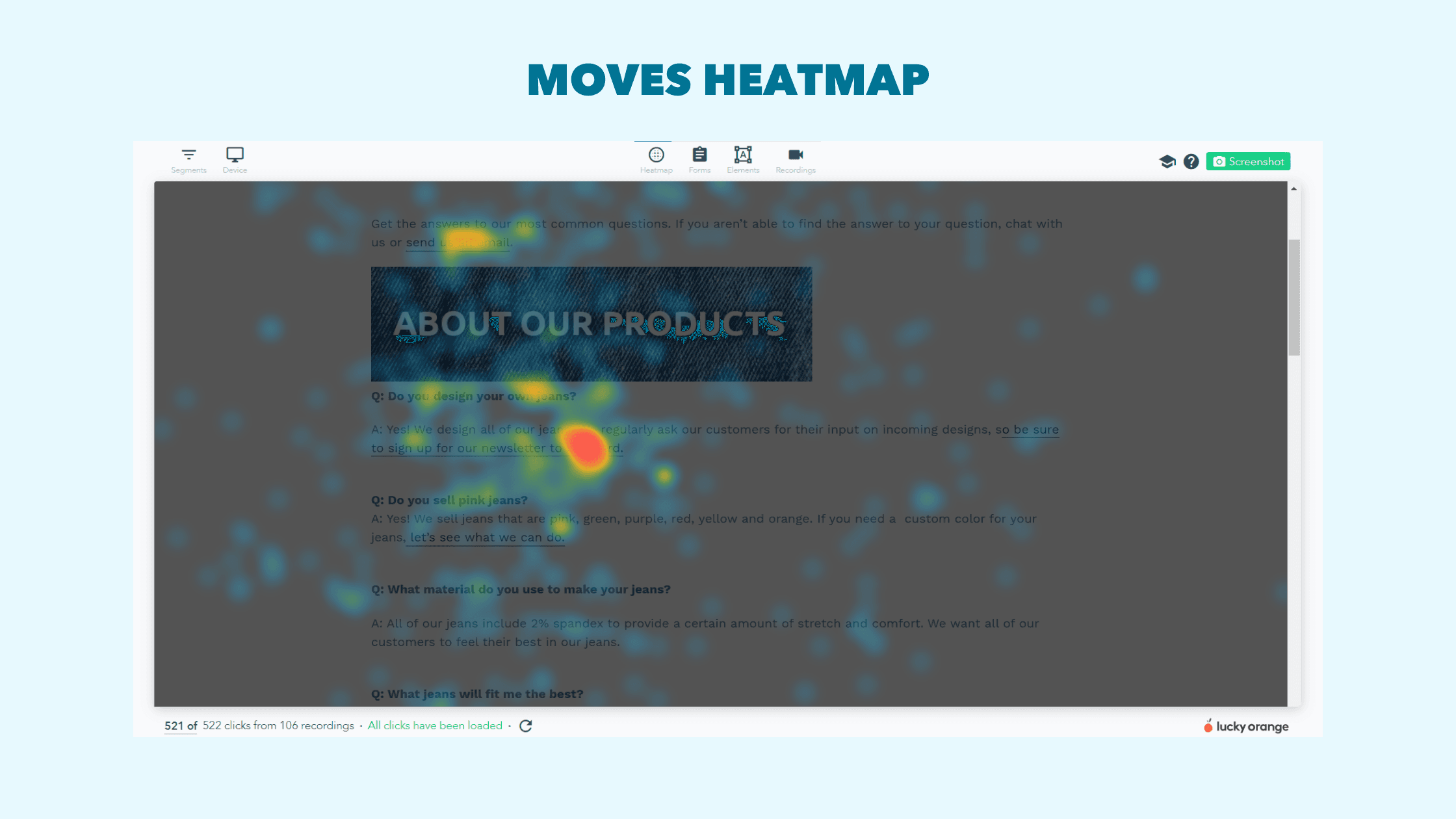 There are three different types of website heatmaps in Lucky Orange, Scroll, Moves and Clicks. Each of these heatmaps surface a different type of visitor behavior that can be used to gain deep insights.